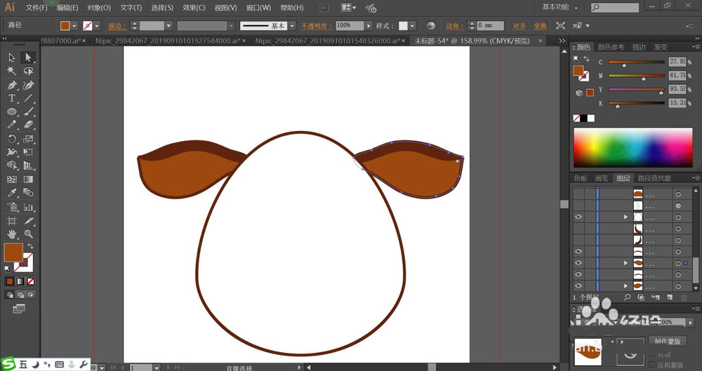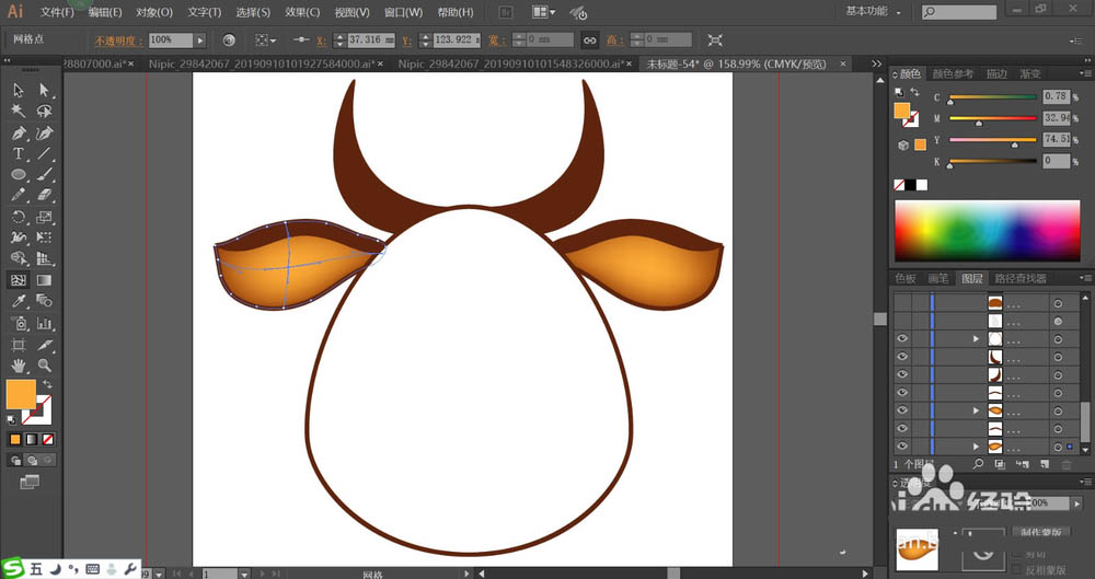 3、继续使用红棕色填充牛头上面的两只角,我们用网格工具点击一下牛耳朵的内部让其呈现黄棕色的渐变效果。