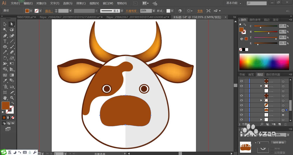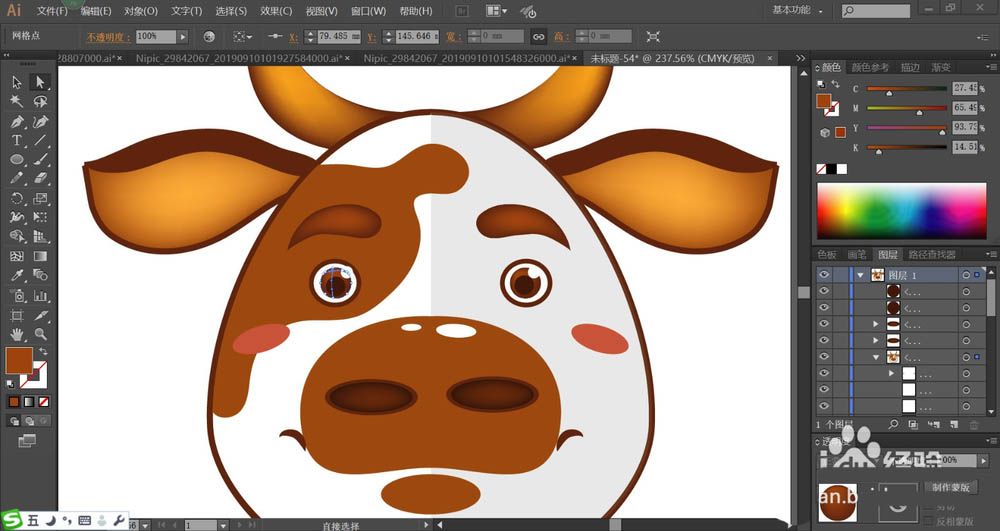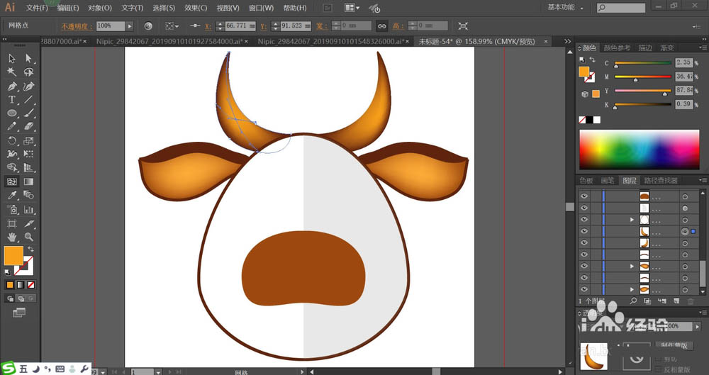 4、继续使用网格工具点击一下左右两只牛角让其呈现红棕色的渐变效果,再用黄棕色填充牛的鼻子轮廓。