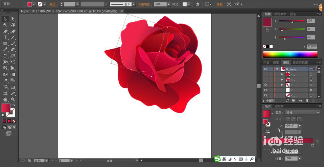 2、我们用不同的红色渐变分别填充每一片的花瓣,让花瓣的色调有深浅的变化,在花瓣的边缘用叠加模式让花瓣的厚度呈现出来。