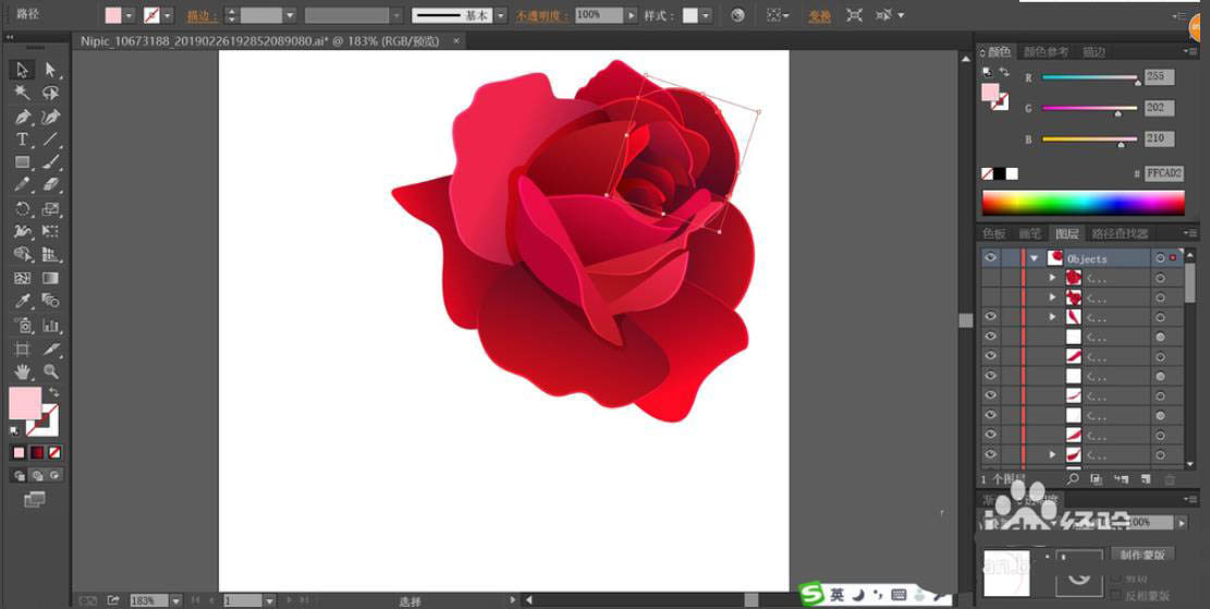 1、先用钢笔画出第一朵较大的玫瑰花的路径,细节元素就是每一片花瓣的形状路径。