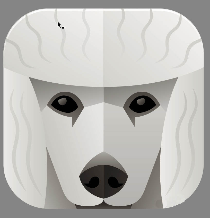 8、最后,我们用两种灰白色的渐变填充贵宾犬的额头左右两侧,再用灰色的渐变填充波浪形状的毛发图案,完成贵宾犬头像设计。