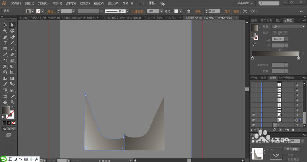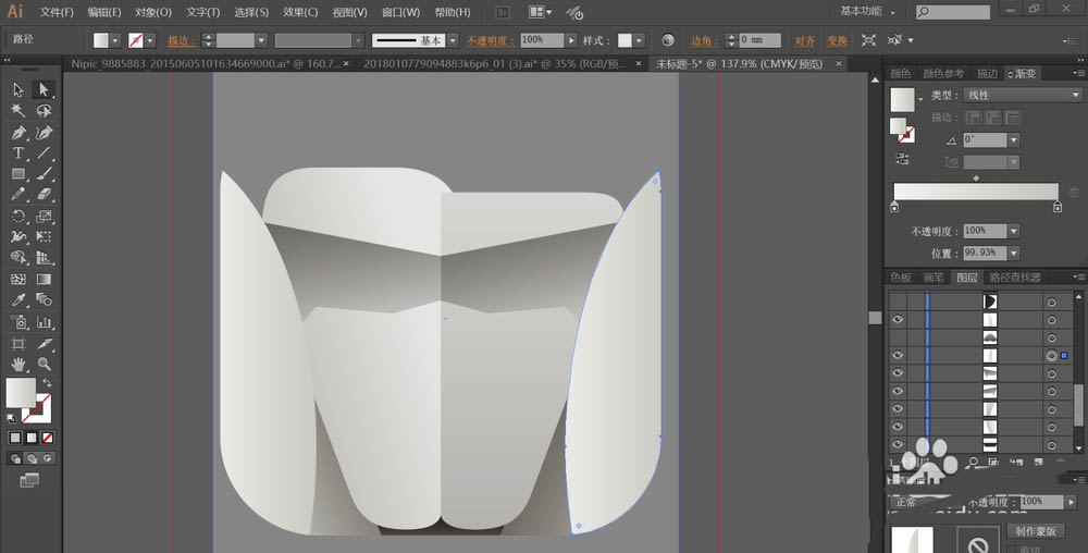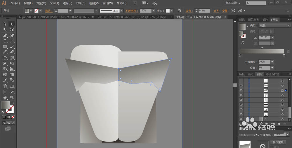 5、设置灰白色的渐变填充贵宾犬的脸部左右两侧的耳朵所在的路径。