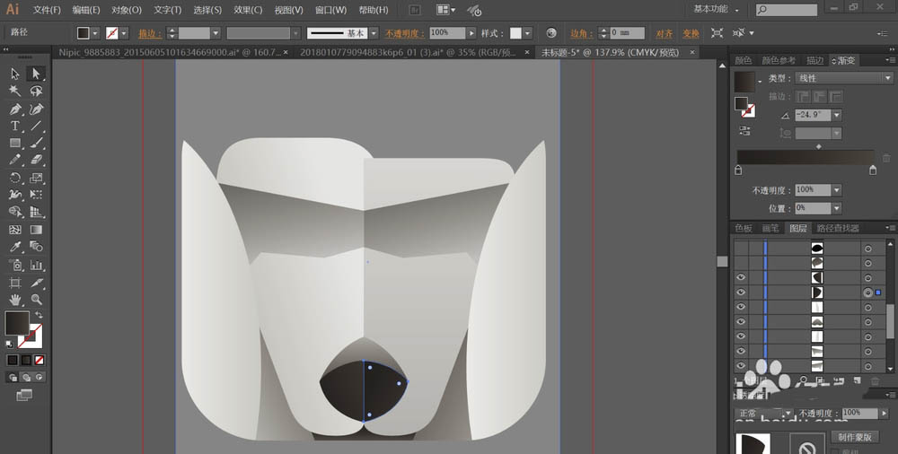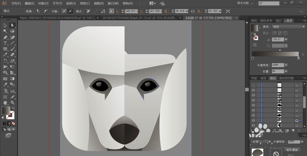 6、这一步,我们用灰色的渐变与黑色的渐变搭配填充贵宾犬的鼻孔的上方与下方的左右两侧,让鼻头的效果出来。