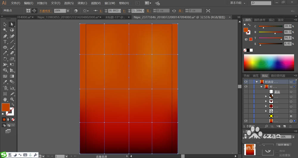 1、先用桔黄色填充背景,再用网格工具点击一下这个背景,让其上方为桔黄色,下方为桔红色,最下方为暗红色。