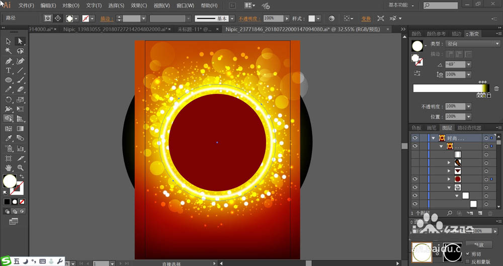 5、接着,我们用灰白色的径向渐变填充圆形并与圆圈做蒙版效果,同样复制在中间大圆圈的周围呈现出一种白光的效果。