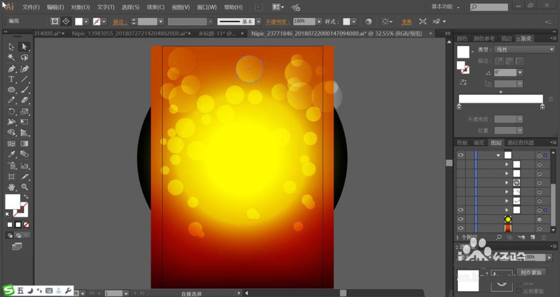 3、接着,我们用灰白色的渐变填充圆形,设置色彩模式为柔光,不断的复制光圈并改变大小分布到背景的多个位置。