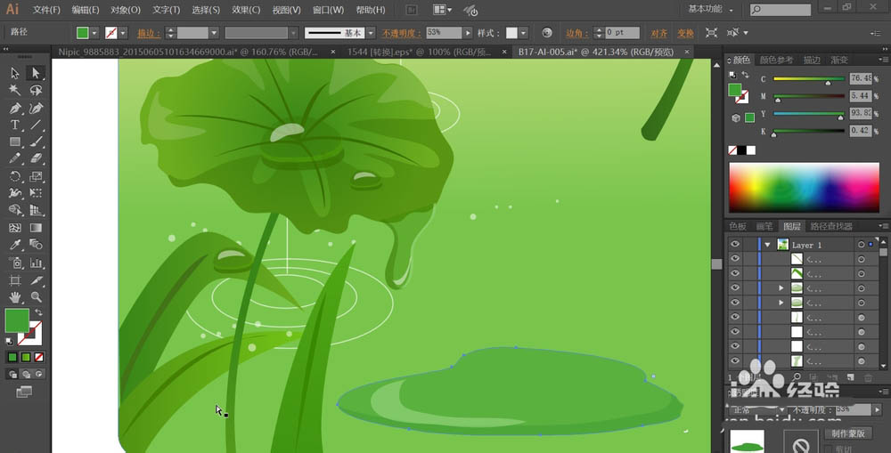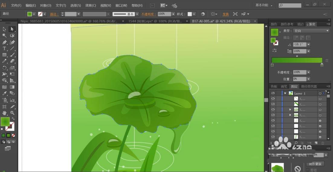 2、接着,我们用嫩绿色的渐变填充荷叶,再分别用暗绿色与淡绿色去填充荷叶上的暗光与高光效果路径,分别设置高光与暗光透明度为10%和30%左右。