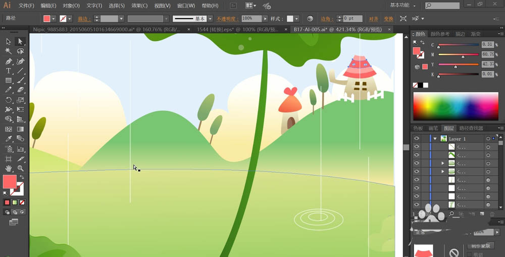 1、使用钢笔画出天空、云朵、高山、草地等多个不同元素,再画出荷叶的叶片与茎杆、雨滴等周边元素的路径,接着,我们再画出高山上的房屋的细节路径。