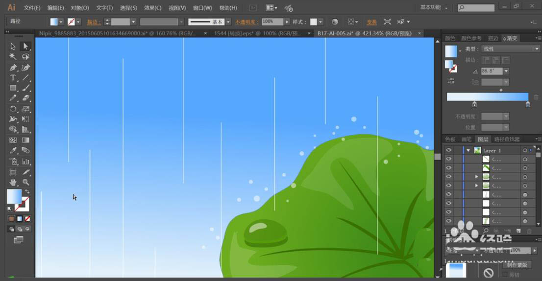 7、最后,我们用天蓝色的渐变填充天空,再用半透明的白色填充空中的线条雨滴与圆点雨滴,设置雨滴为半透明的效果,完成雨天背景设计。