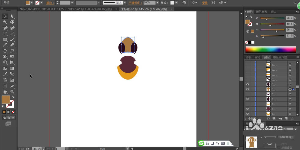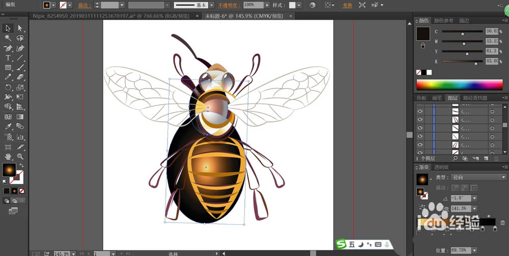 2、我们用金色与灰黑色搭配填充蜜蜂的头部的路径,用红棕色与橙色搭配填充蜜蜂的身体前面部分。
