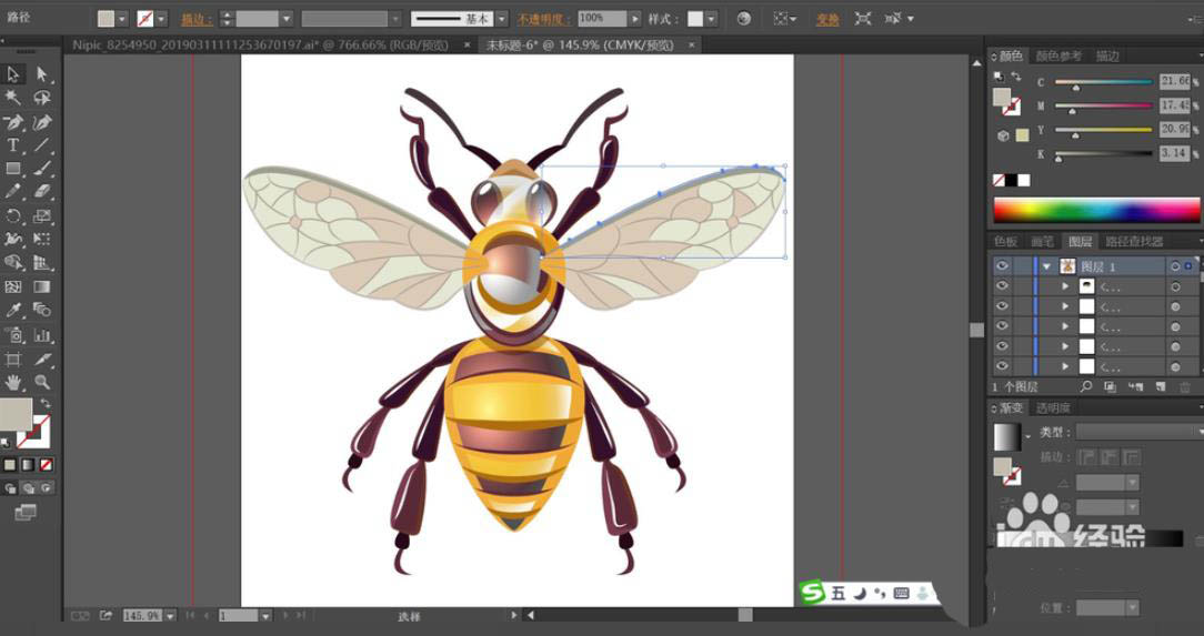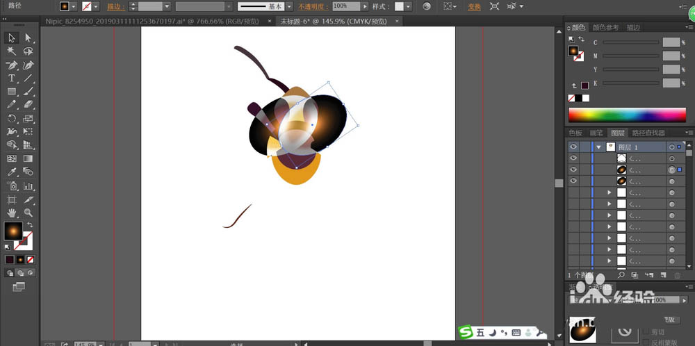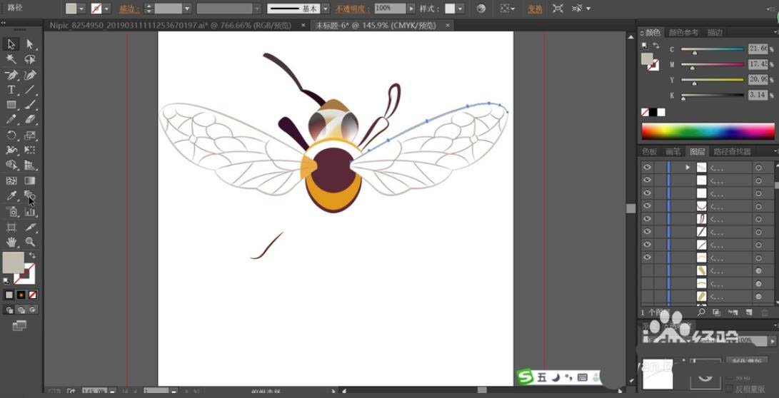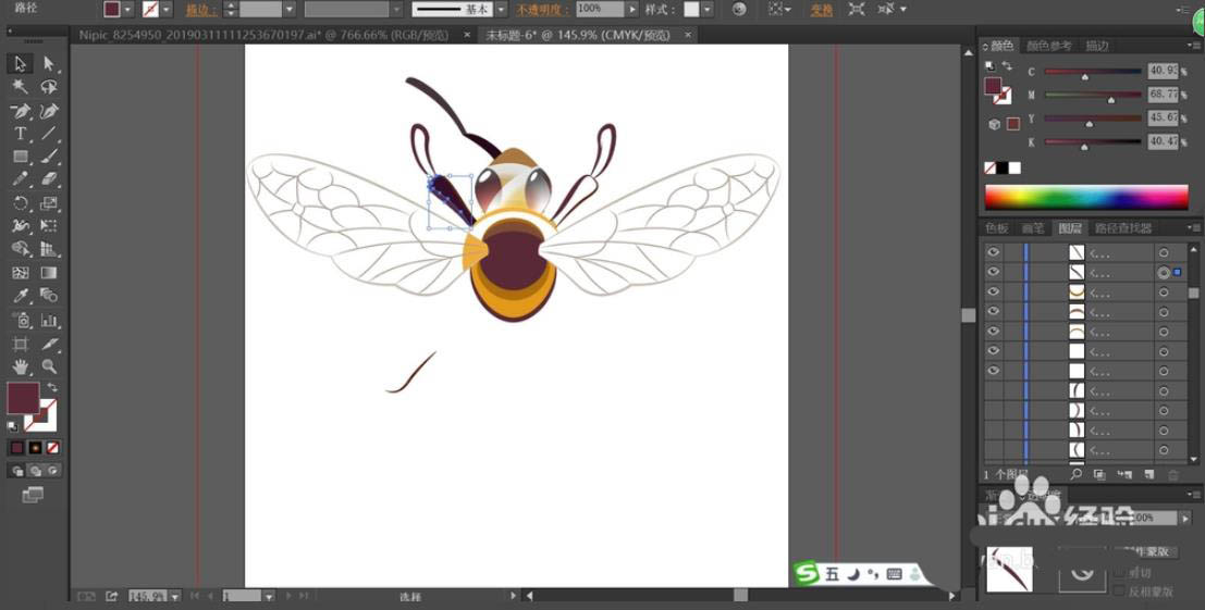 4、依次对于蜜蜂的触角与腿进行描边,填充蜜蜂的腿为红棕色与暗红色,再用红棕色对于蜜蜂的腿部进行描边。用灰白色对于蜜蜂的翅膀路径进行描边。