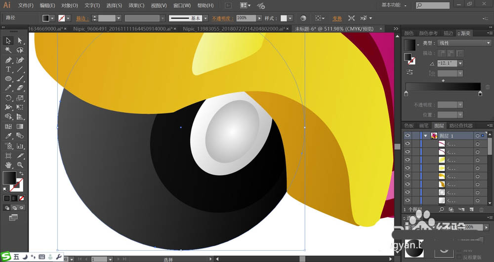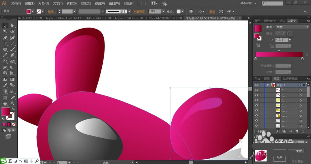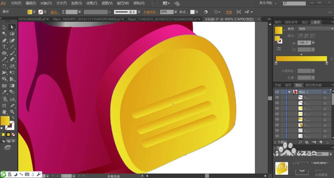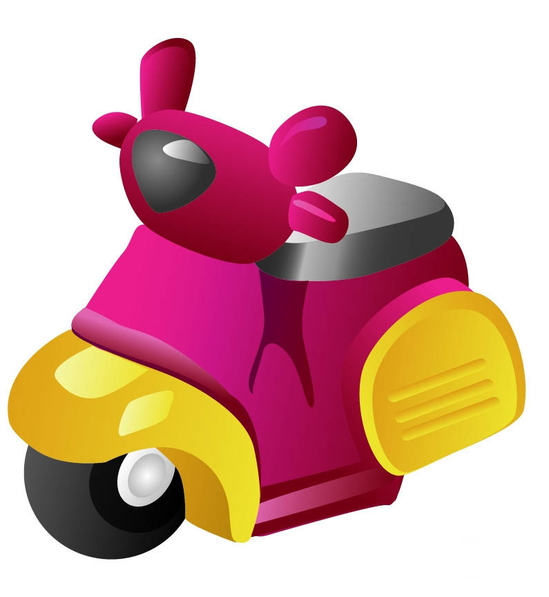 7、最后,我们用不同明度的品红色渐变填充车体,外边缘用较暗的品红色,内部用较亮的,从而让明暗效果呈现车体上面。车右侧的结构件用品红色的渐变与黄色的渐变搭配填充,不同的黄色结构件改变渐变色的角度,完成玩具车图片设计。