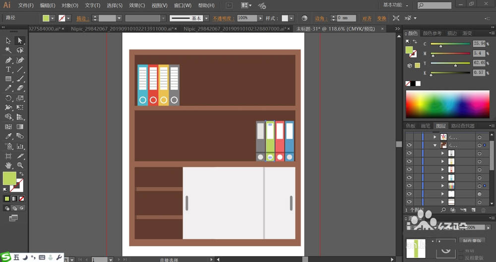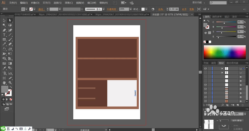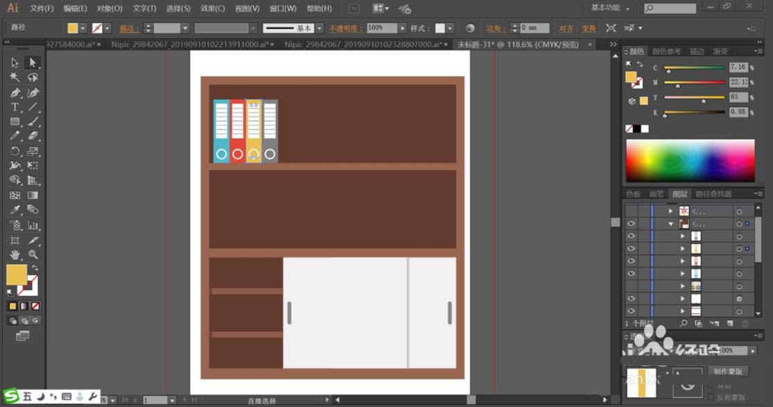 4、接着,我们用灰白色与灰色搭配填充书柜下方的正面与拉手的路径,搁板用浅棕色填充正面。