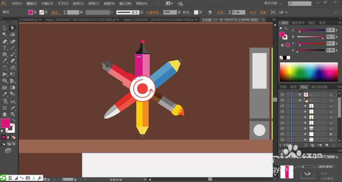 6、接着,我们用同样的方法填充第二排的书本,主要包括灰、绿、红、蓝四种色彩,再用钢笔画出画笔的基本轮廓,画笔的前端画出明暗两个路径。