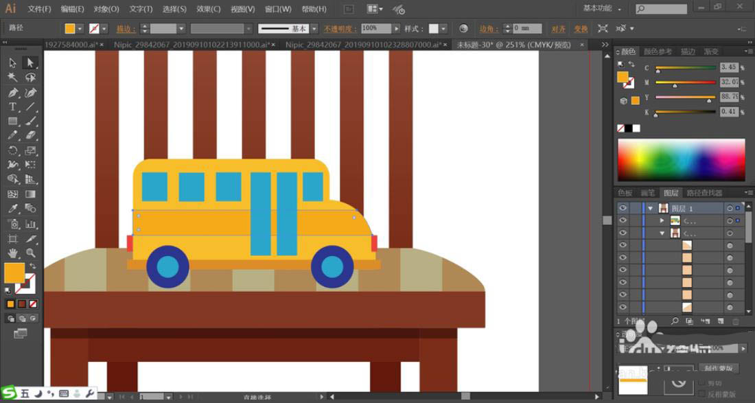 7、最后,我们用三种明度的橙色填充车体,再用蓝色填充车窗,使用蓝黑色与蓝色搭配填充车轮,使用红色填充车灯,再用网格工具点击一下车窗、车轮、车灯做出渐变色的效果,完成木椅图片设计。