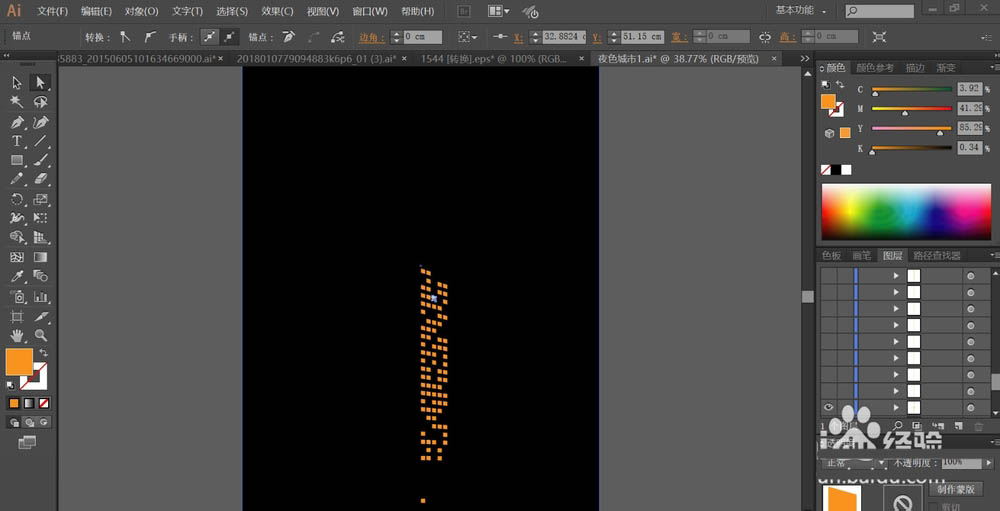 3、稍稍调整一下橙黄色的亮度,我们用较亮的橙黄色填充高楼的左侧面墙壁的路径。