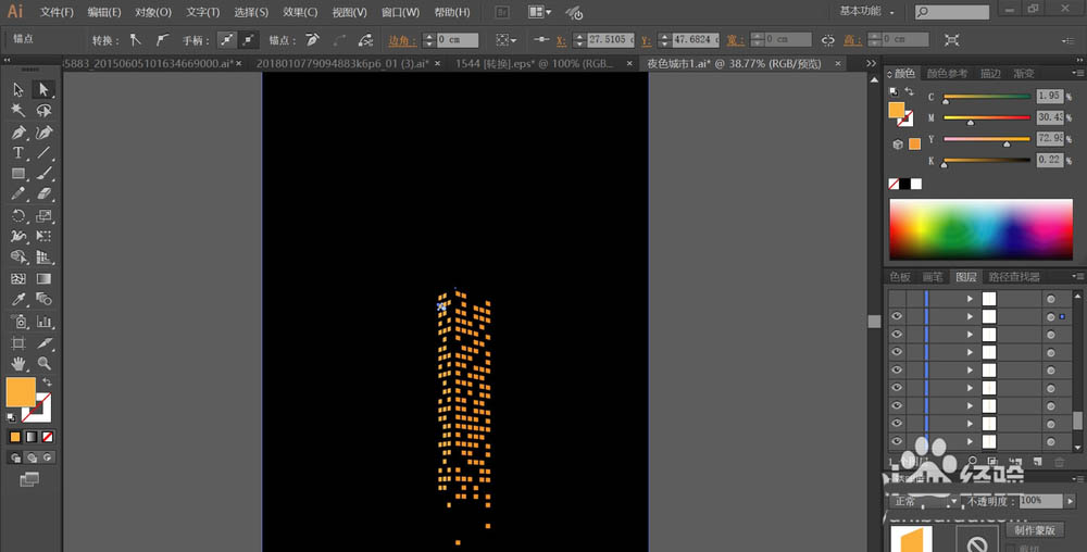 4、使用同样的方法用两种不同的橙黄色填充高楼的左右侧面,再用不同的橙黄色填充高楼顶端的线条,让众多的高楼客户灯光在夜晚中呈现出来。