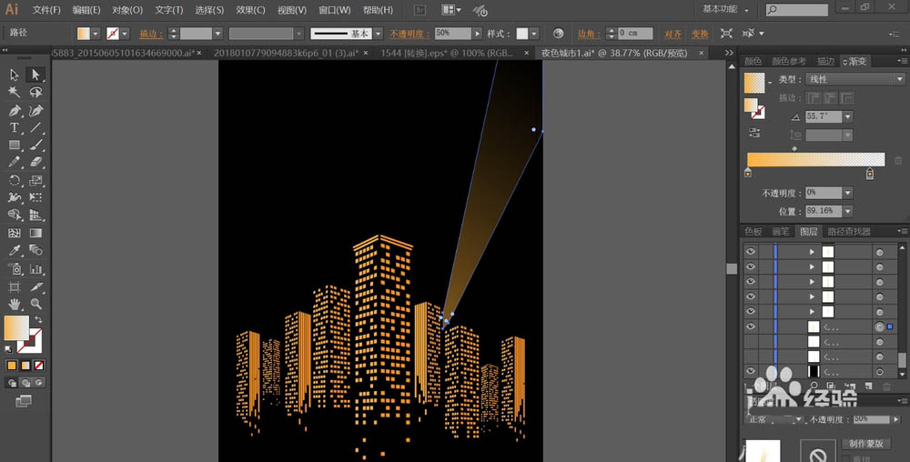 1、使用钢笔画出高楼的基本轮廓,再把高楼上面的窗户进行复制,从而完成高楼的左侧面与右侧面的绘制,复制高楼让其成为远处的大楼并改变大小让其符合近大远小的规律,再绘制出灯光路径与文字路径。