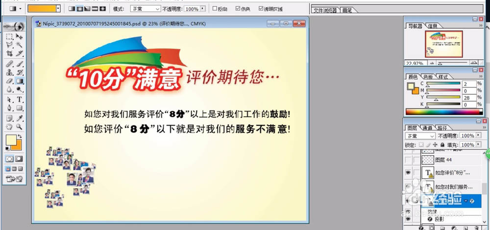 满意度调查是各行各业都要经常做的,我们有一个设计精美的表格也会激发客户的主动性。我们的表格封面主要有标题、员工照片、笑脸这些元素组成,其它还可以加上标志在封面的左上角,加上口号在右上角,该怎么设计这张海报满意图表呢?下面我们就来看看详细的教程。