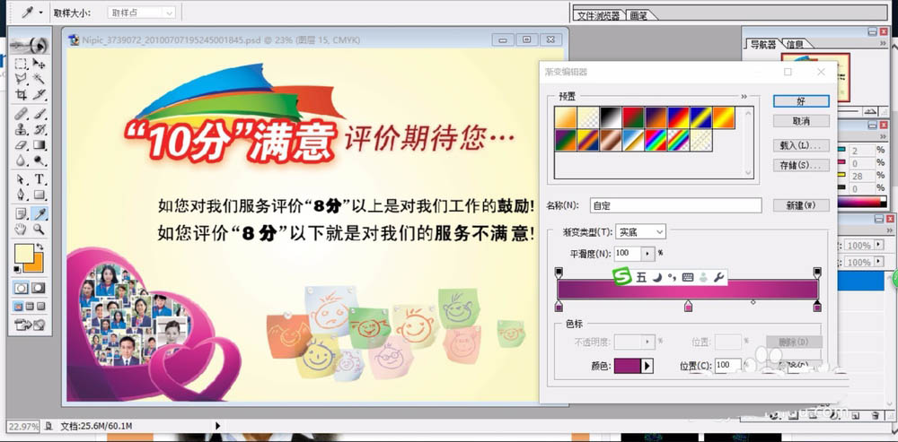 9、继续用钢笔画出一个心形,让心形的中间有一个镂空的心形,我们填充心形为紫红色的渐变,让照片在心形的中间呈现,完成满意度调查表封面设计。