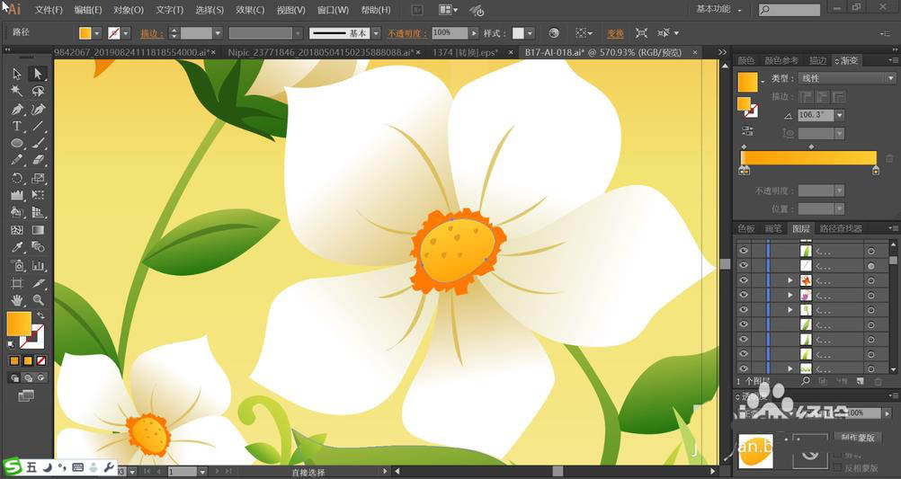 4、设置红褐色的渐变与黄色渐变搭配填充蝴蝶,再用灰白色的渐变填充花朵的花瓣。