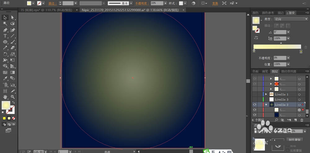 1、先用蓝黑色填充背景所在的正方形,再用黄白色的透明渐变填充背景上的大的圆形灯光,设置模式为强光,透明度为50%