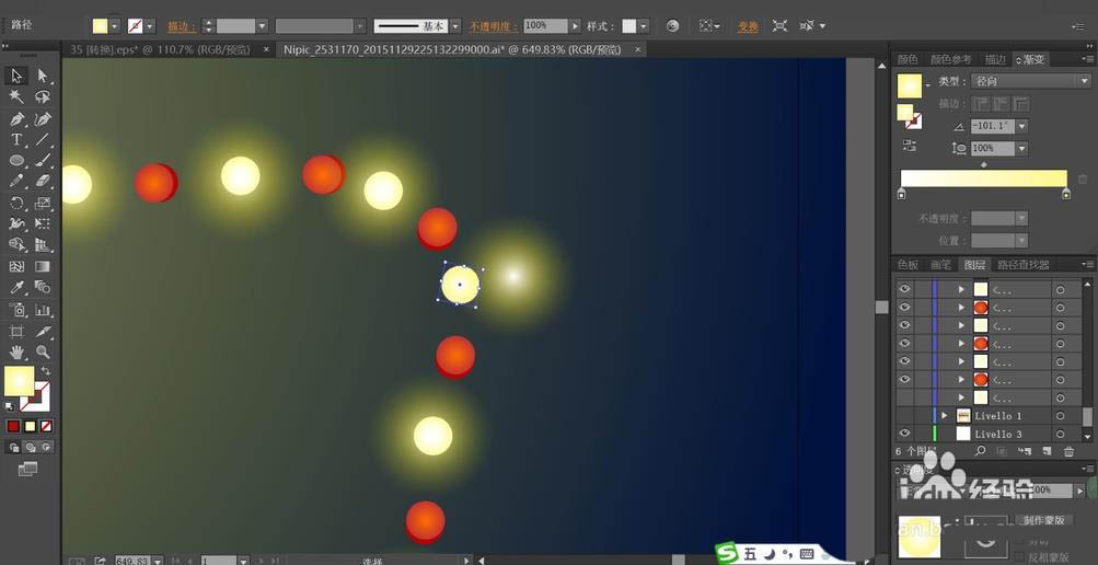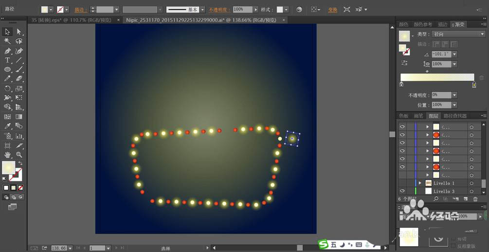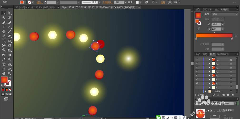 2、接着,我们用圆形工具画出霓虹灯所有的灯泡,让其围成一个不规则的方框,用半透明的黄白色的渐变与红棕色的渐变填充,分别设置色彩模式为强光。在红灯下面放一暗红色作为底色。