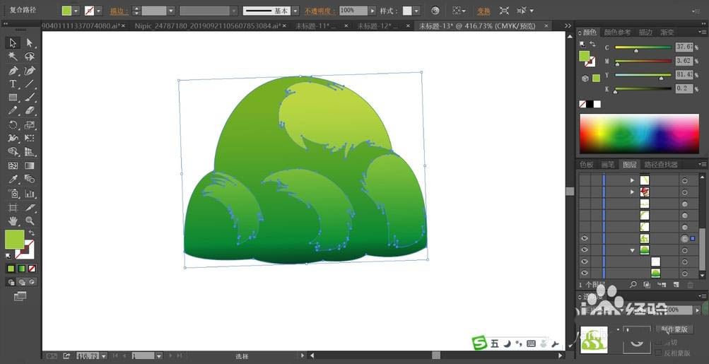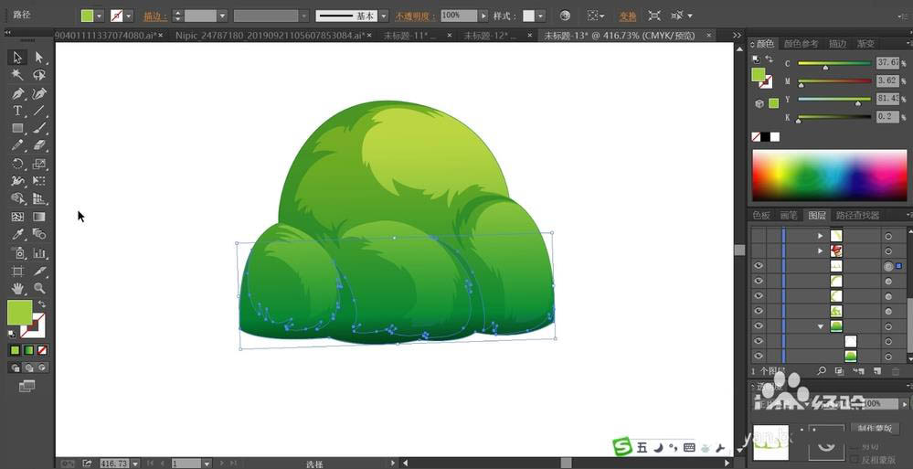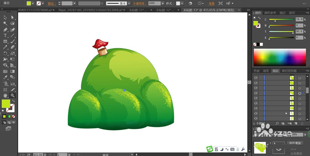 4、这一步,我们在绿屋的正面绘制出很多的不规则形状的小叶片,每一个叶片都填充黄绿色,把这些叶片均匀分布到绿屋的三个凸起上面。