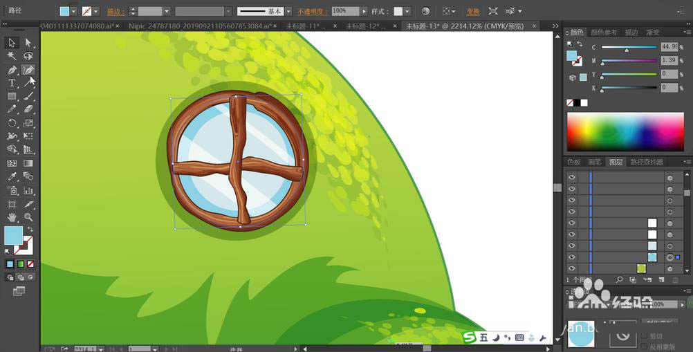 5、接着,我们使用圆形工具与钢笔绘制出小屋上面的圆形小窗户,窗户的边缘用灰棕色填充,在边缘与中间做出暗光与高光效果,窗户的玻璃用蓝白色的渐变与天蓝色搭配填充。