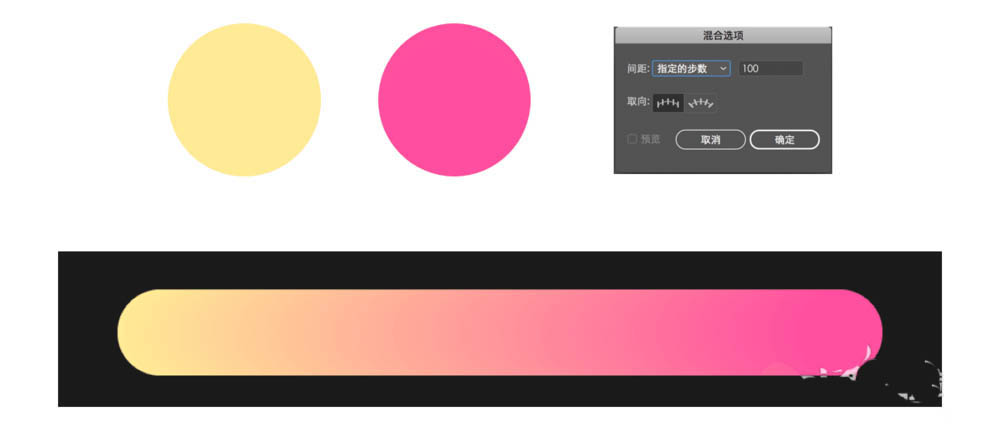 2、画出两个不同颜色圆,选择混合模式中的指定步数,设置100,然后从左边到右边链接即可。