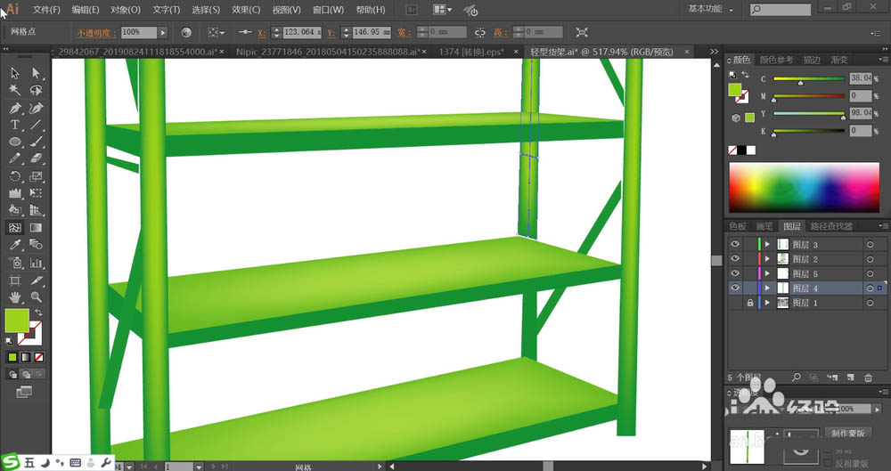 3、使用网格工具点击一下搁板的路径让其呈现黄绿色的渐变效果,重点在下面两层的搁板实现渐变色效果。