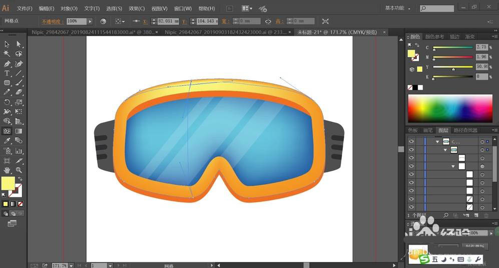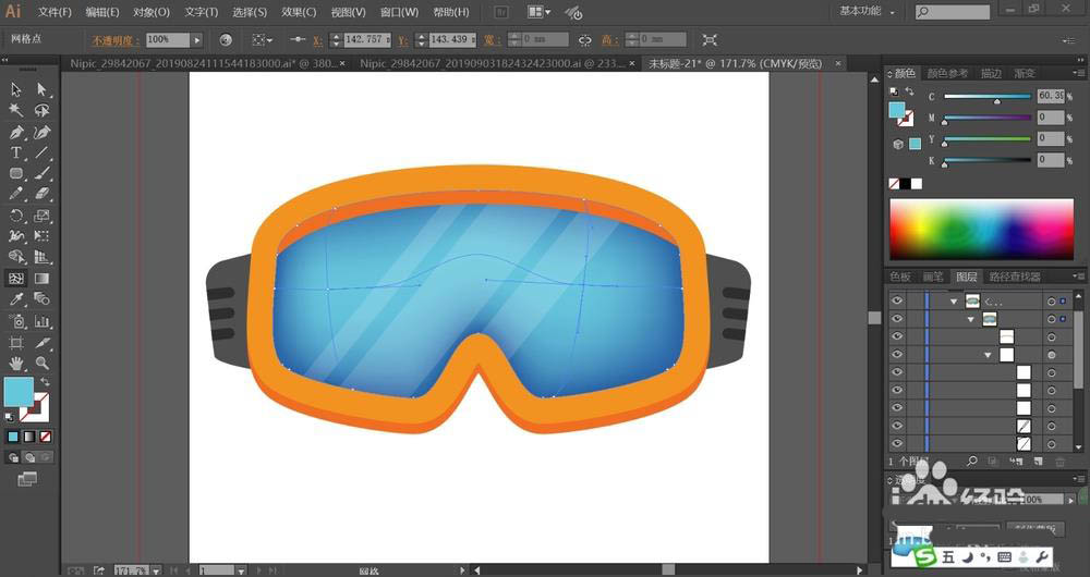 7、最后,我们选择网格工具分别点击镜片与镜框,让其呈现蓝色的渐变与橙色的渐变,从而为太阳镜打上高光效果,完成太阳镜图片设计。