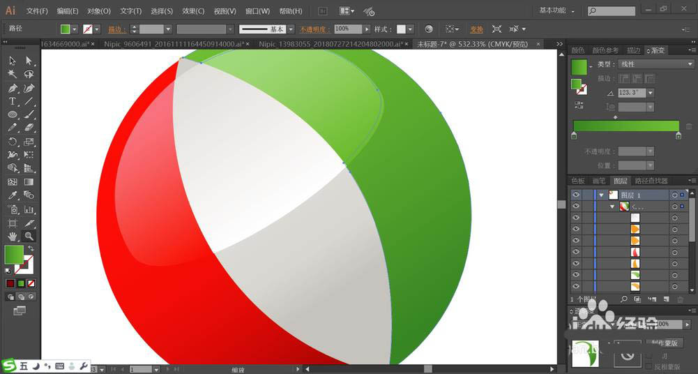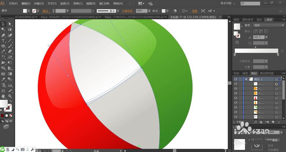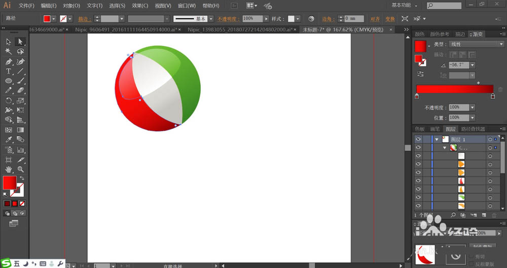 2、使用红色渐变、灰白色的渐变、绿色渐变填充水球的三个侧面路径。