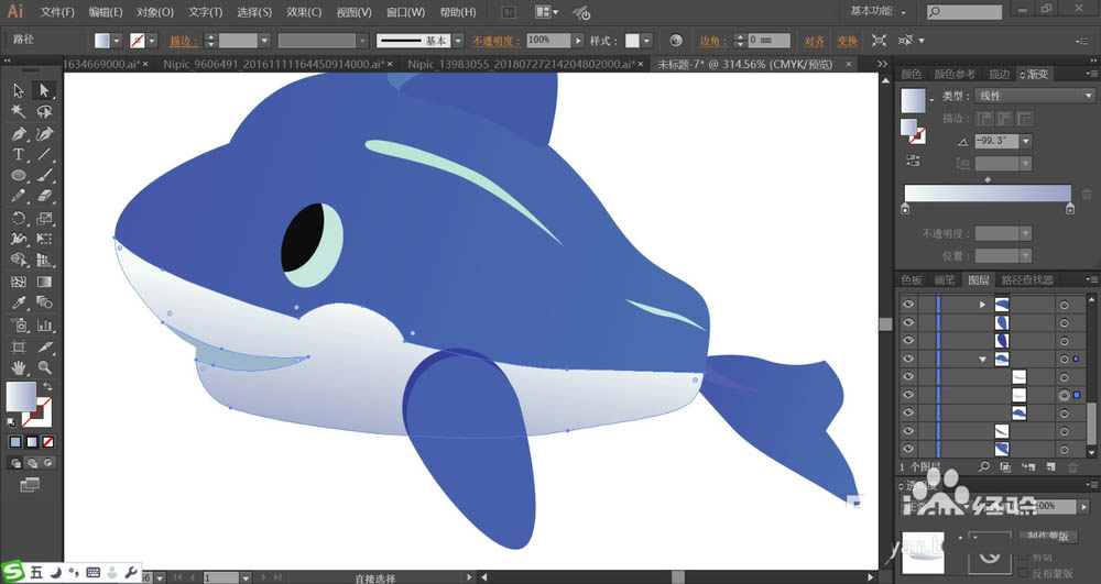 4、继续用明暗两种蓝色分别填充鱼鳍的正面与顶端,顶端为亮光。海豚的身体用蓝色的渐变填充。