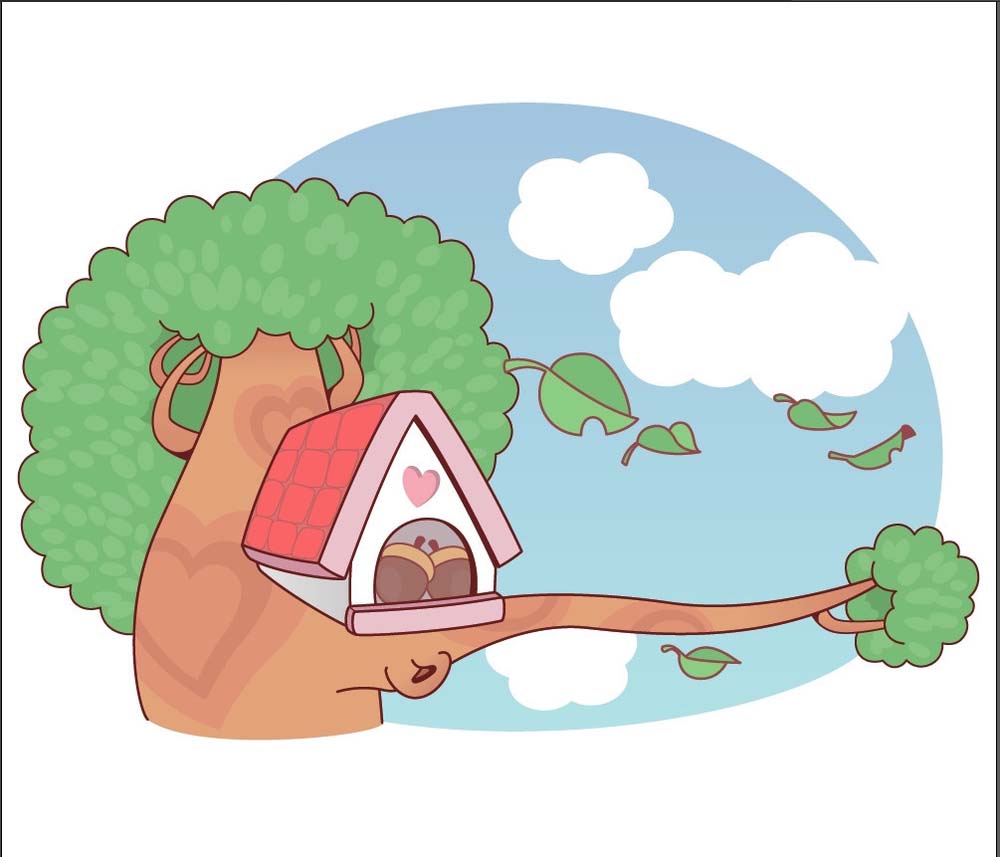树屋是一个非常接近自然的地方,很多动画片里都有,该怎么绘制这幅矢量图呢?今天,我们就来画一画树屋,从中学习一下绿色与灰棕色搭配技巧,掌握使用蓝白色、梅红色与朱红色、桃色搭配的技巧,体会绘制大树、树屋、蓝天白云的过程,下面我们就来看看详细的教程。