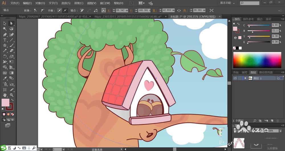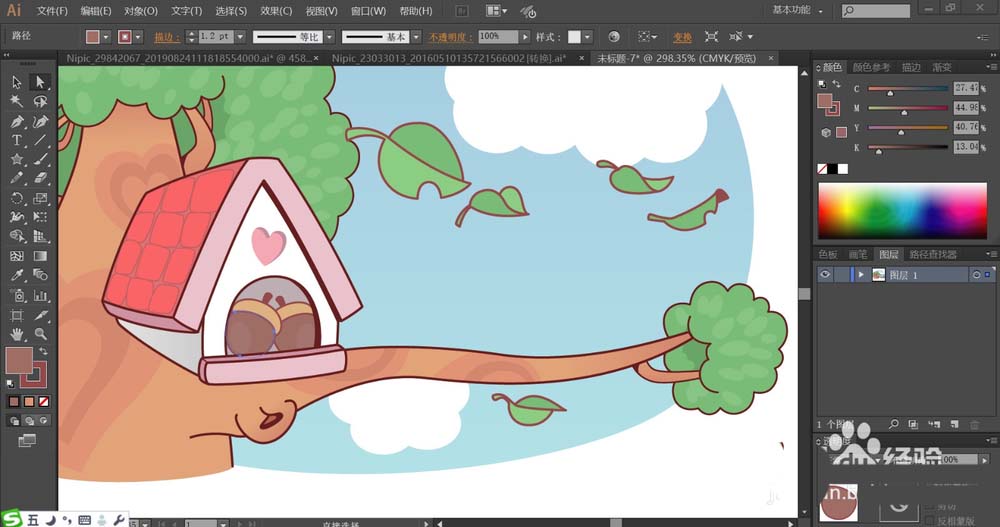 6、使用暗粉色与粉红色搭配填充树屋门口下方的结构件的路径,再用绿色与红棕色搭配填充蓝天中飘落的叶子路径。