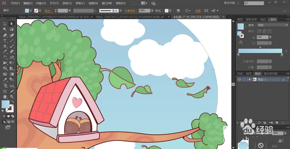 7、使用天蓝色的渐变填充天空,使用白色填充白云的路径,完成树屋图片设计。