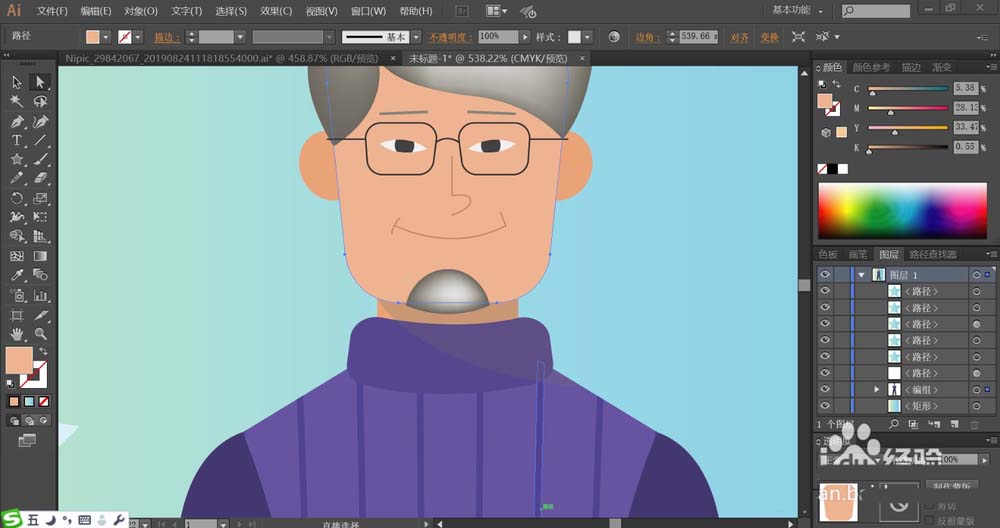3、使用网格工具点击胡子让其呈现灰色的渐变效果,再用蓝紫色与蓝色搭配填充衣领与上衣,脖子右侧的暗光用透明度为20%左右的黑色填充。