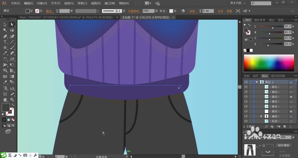 5、使用灰黑色填充长裤,再用黑色对于裤子的口袋进行描边。