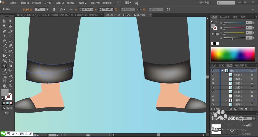 7、使用网格工具点击裤管与鞋面让其呈现渐变色效果,再用淡蓝色到淡绿色的渐变填充背景,星星用一样的渐变色填充,我们对于左侧的星星设置滤光的色彩模式,完成居家男人形象设计。