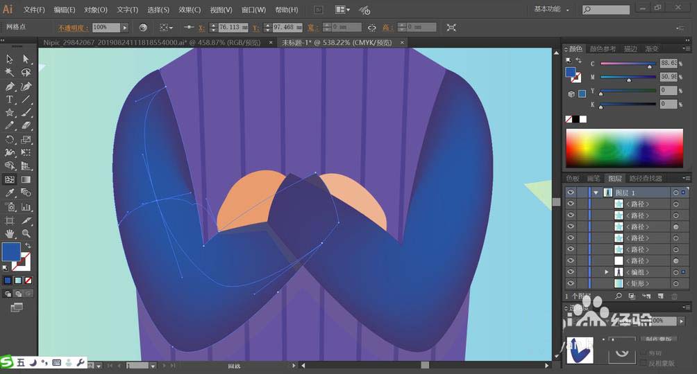 4、使用深蓝色与粉色搭配填充衣袖与手掌,再用网格工具点击衣袖让其呈现深蓝色渐变的效果。