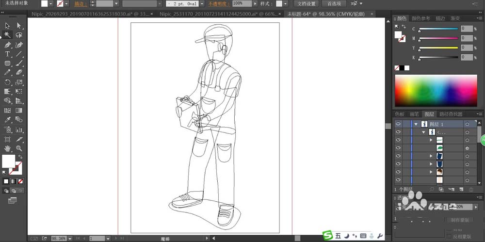 1、先用钢笔画出工人的基本身体轮廓,再画出服饰的细节元素的路径,接着,我们画出人物的手臂与站立姿态路径,最后,我们再画出工人手里的文件夹的细节路径。