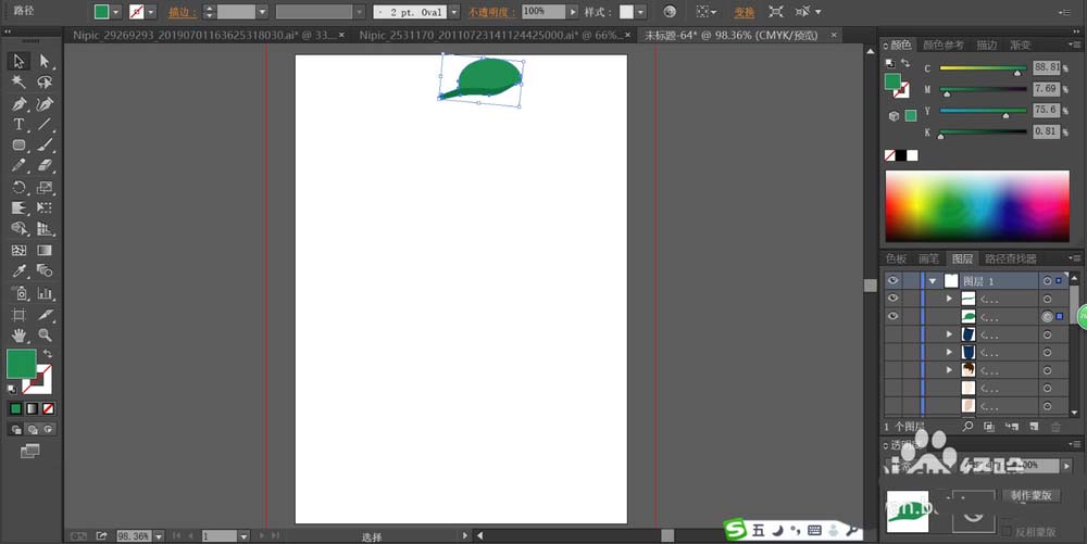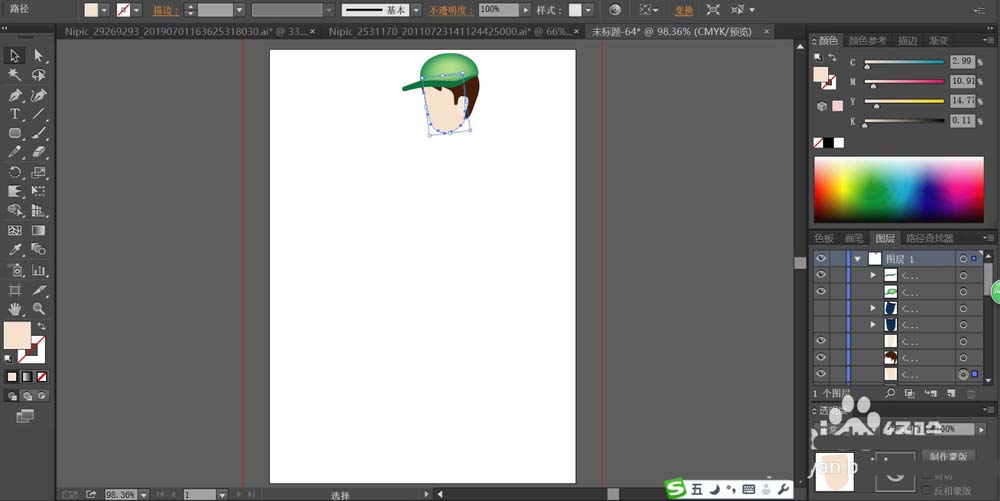 2、用两种不同亮度的绿色填充帽子的前后两种结构,我们给帽子后面用网格工具做一下绿色渐变效果。