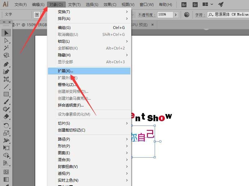 1、使用【选择工具】选中汉字,执行菜单中的【对象】【扩展】命令,在弹出的扩展对话框中单击【确定】按钮,将文字转化为图形。