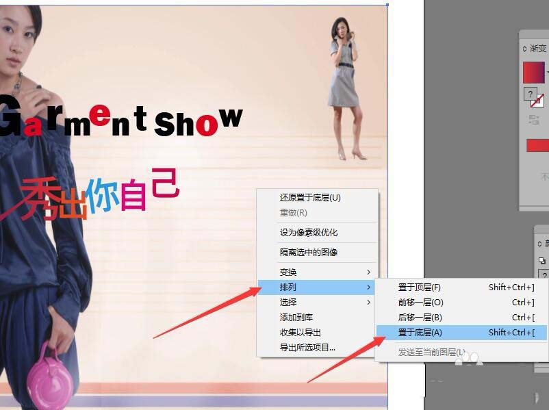 5、按Shift+Ctrl+[组合键,将广告背景置入到文字的下方。
