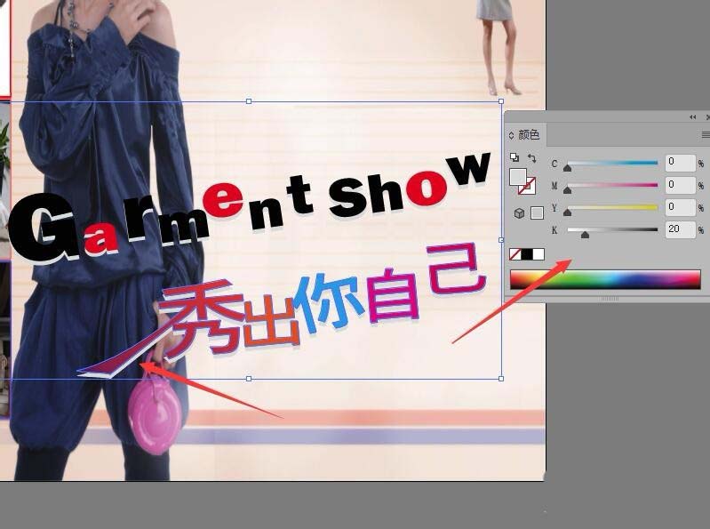 7、同时选择两组文字按Ctrl+C进行复制,按Ctrl+B粘贴在后面,颜色修改为灰色(C:0,M:0,Y:0,K:20),按键盘上的向下方向键,将粘贴的图像向下移动一点,呈现出立体形状。后续请看‘illustrator添加修饰阴影制作服饰广告’。