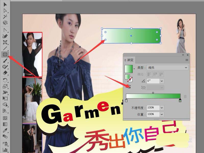 6、使用【圆角矩形工具】绘制一个圆角矩形,为其填充有白色到绿色(C:74,M:0,Y:100,K:0)的线性渐变,然后去除描边。