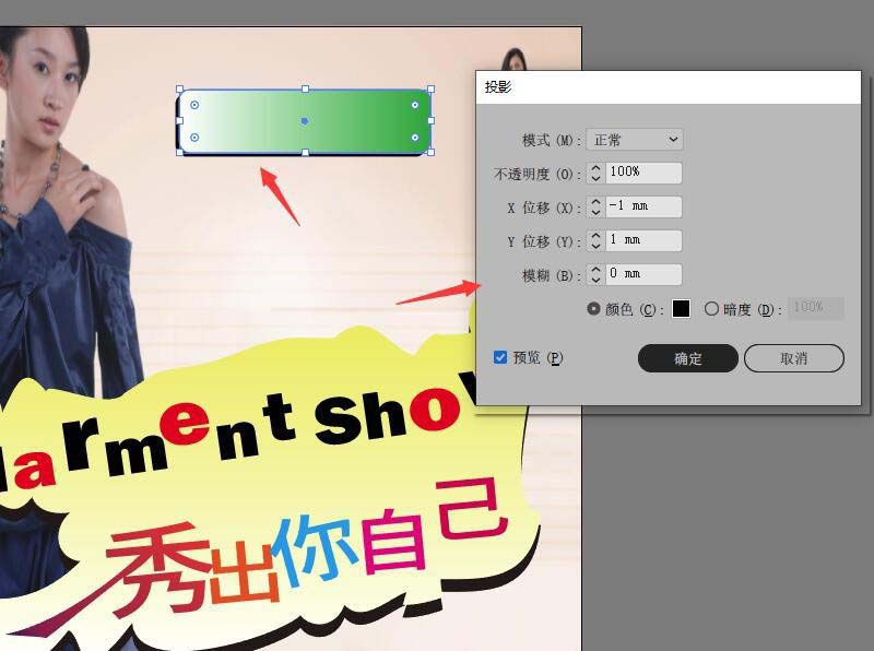 8、在对话框中,设置模式为【正常】,不透明度为100%,X位移为-1mm,Y位移为1mm,模糊为0mm。选择颜色为黑色,单击【确定】按钮。