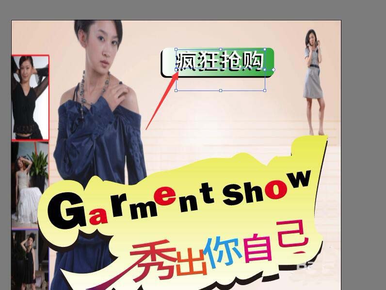 9、在圆角矩形内用文字工具输入白色文字,对文字添加阴影。完成服饰广告的制作。