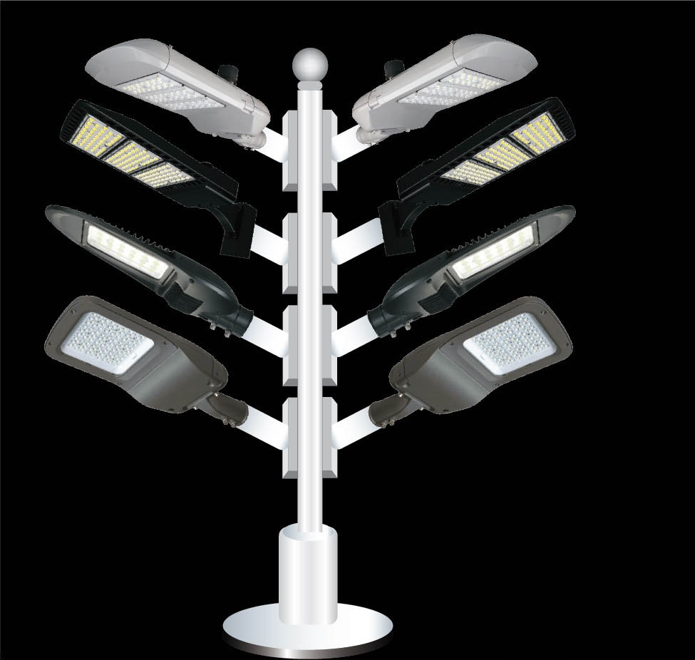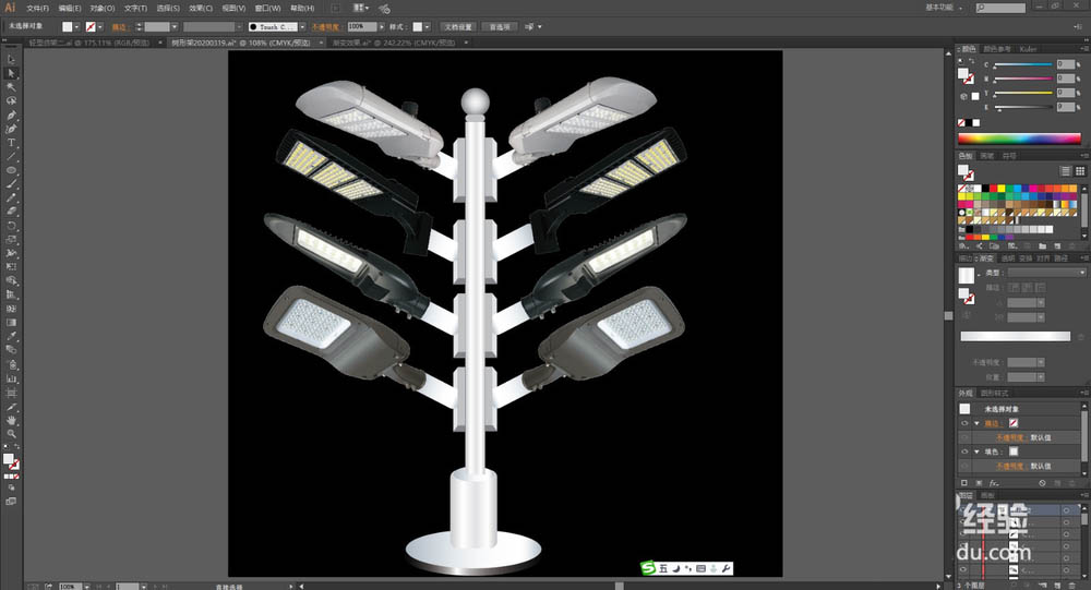 7、最后,我们把不同的路灯放在树形路灯架的不同位置上面,注意保持一个统一有序的状态,完成路灯架产品设计。